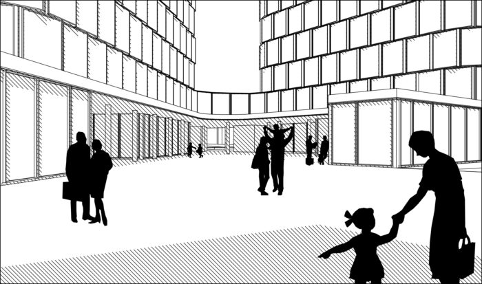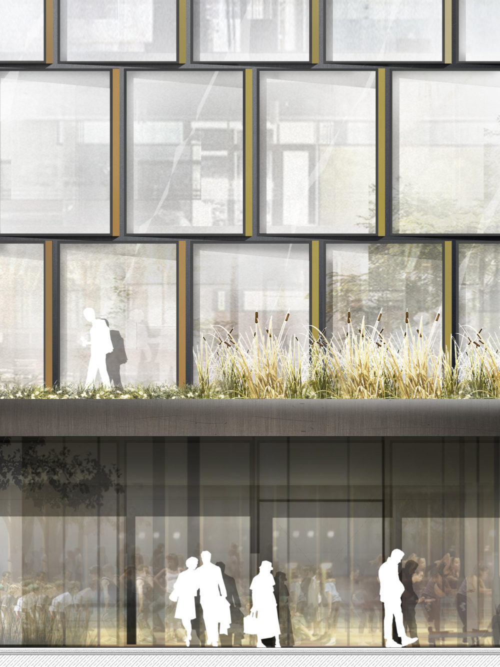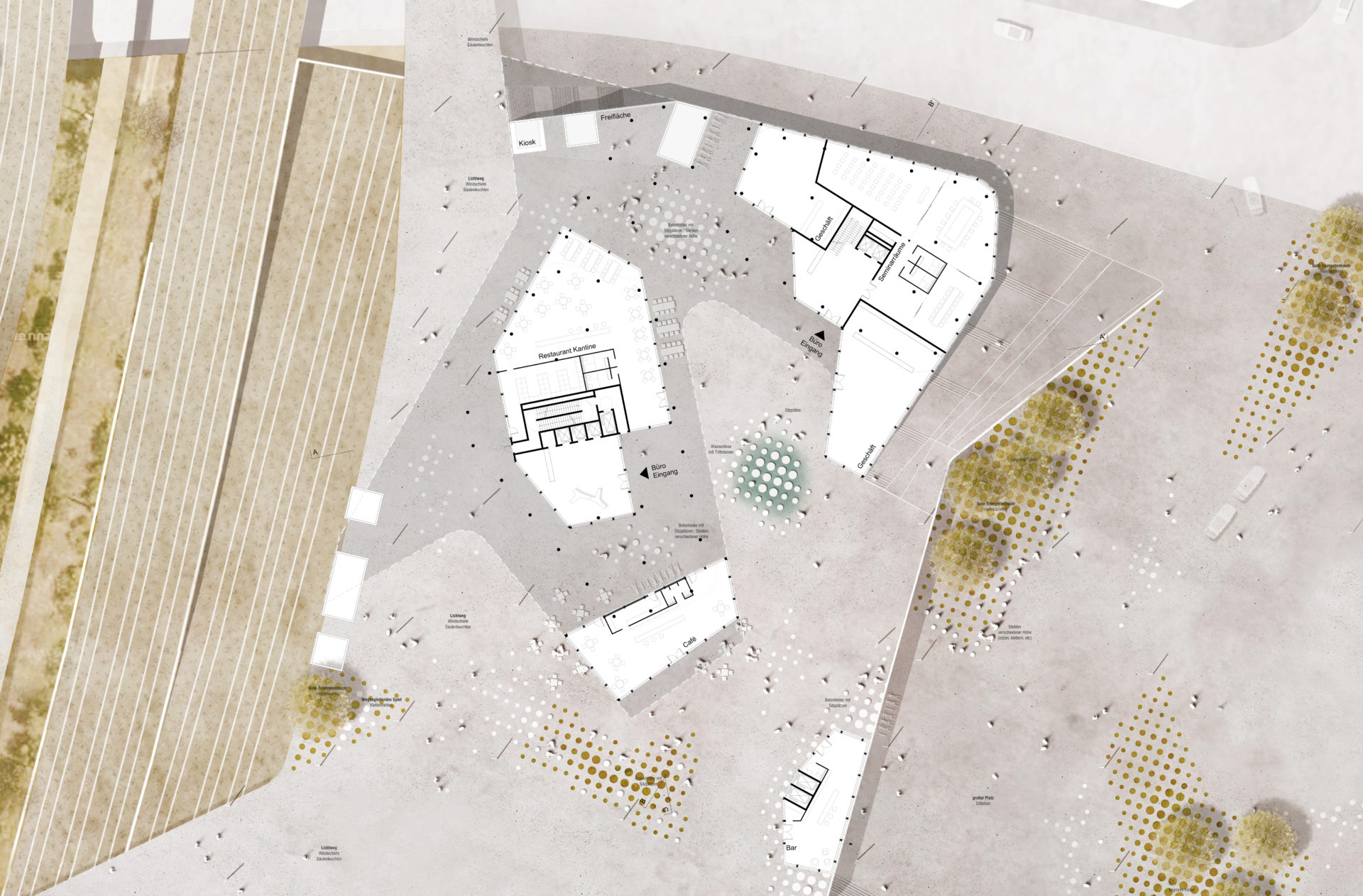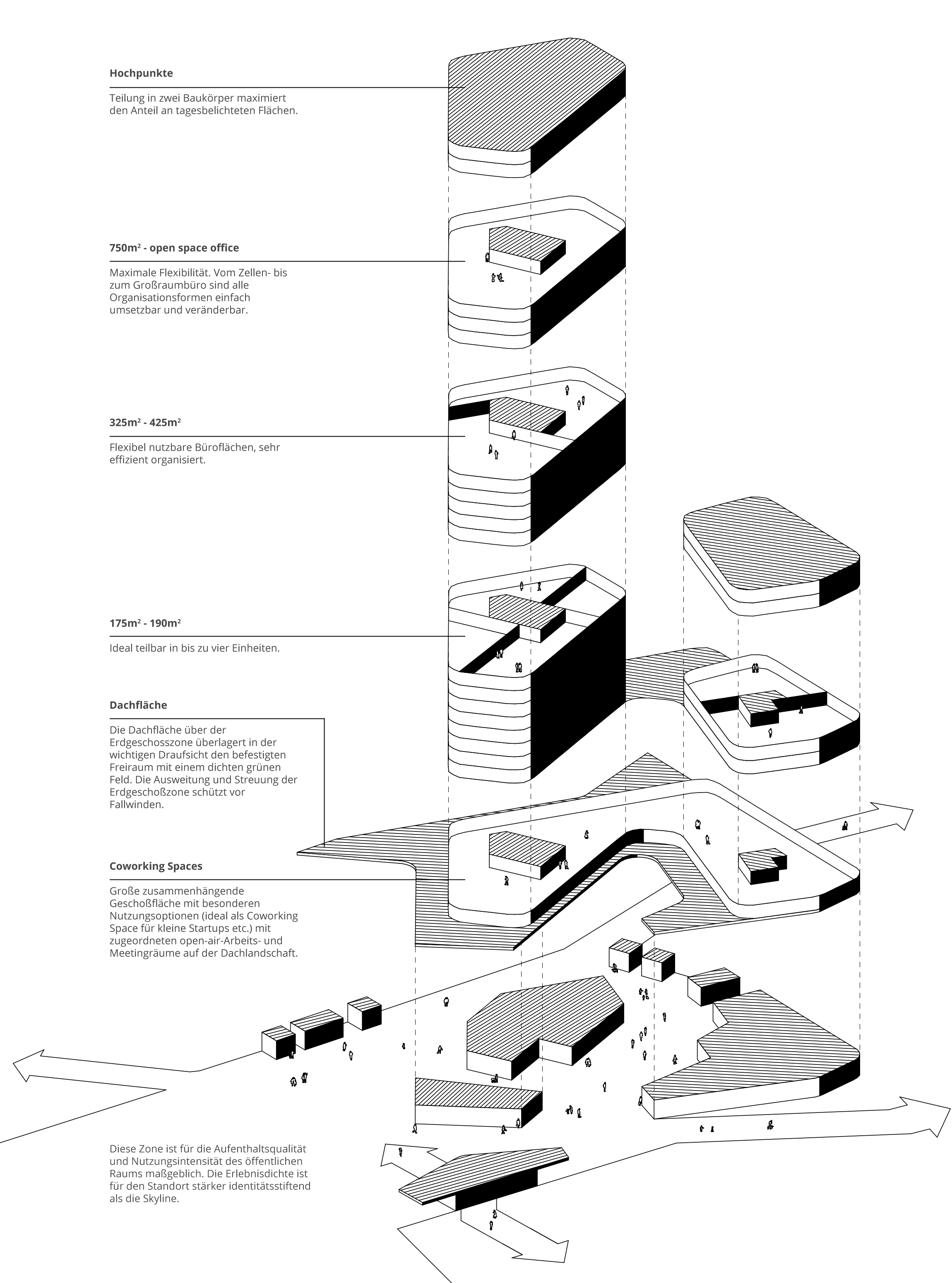 Über dem Sockel wird in der Erdgeschosszone eine speziell charakterisierte Raumschicht angeboten, die eine effiziente Verzahnung der Sockelzone mit den vertikalen Baukörpern leistet. Diese Zone ist für die Aufenthaltsqualität und Nutzungsintensität des öffentlichen Raums maßgeblich. Die vertikale Verdichtung von Nutzflächen erzwingt eine adäquate horizontale Verdichtung im Hinblick auf die Strukturierung und Belebung des öffentlichen Raums: Vielfalt der Raum- und Nutzungsangebote, sowie die Maximierung der Nutzungsintensität zu allen Jahreszeiten, an allen Tagen, auch bei Nacht, bei jedem Wetter.