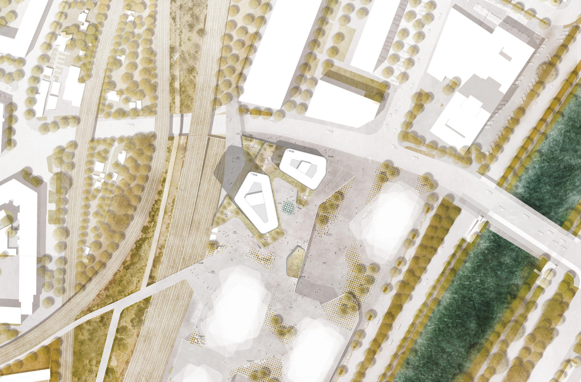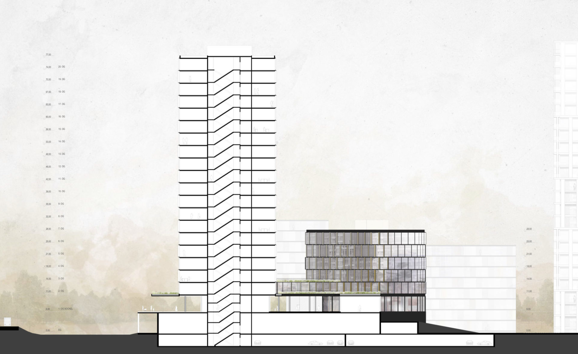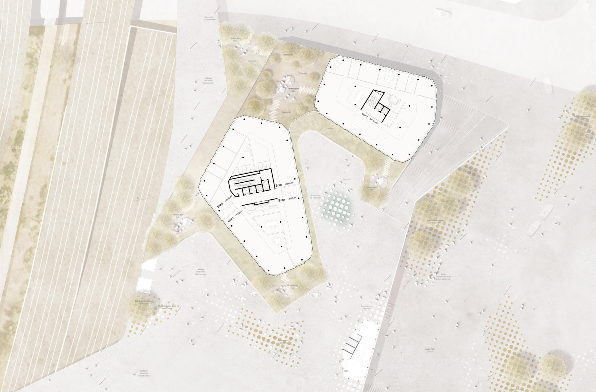 Im Rahmen eines größeren Masterplans, der vier Baustellen mit jeweils eigenem Programm umfasst, die darauf abzielen, Heiligenstadt zu einem idealen Wohn- und Arbeitsort zu machen, konkurrierte unser Büro um zwei dieser Standorte. Ein Team beschäftigte sich mit dem Leben, während das andere (dieses Team) sich mit der Arbeit beschäftigte. Um zu vermeiden, dass nur ein weiteres Bürohochhaus gebaut wird, wurde auf die Gestaltung des öffentlichen Raums im Erdgeschoss und auf das Aussehen der Türme besonders geachtet.