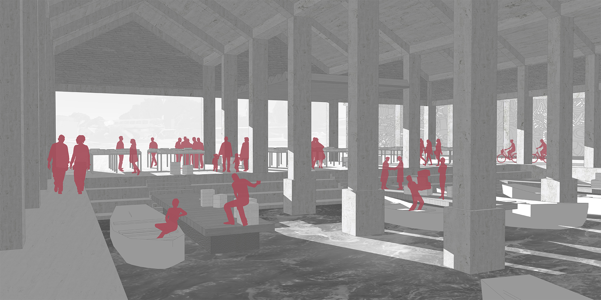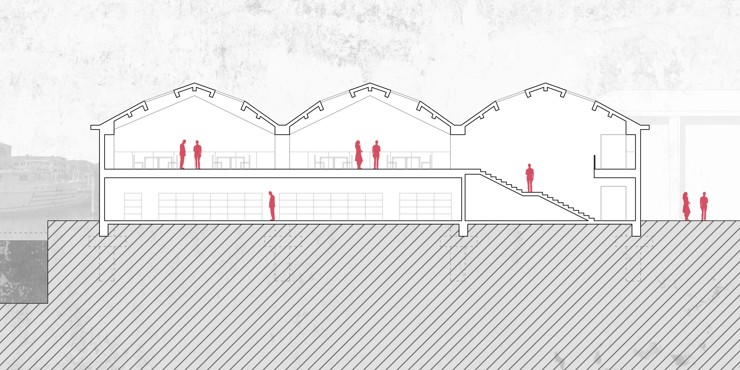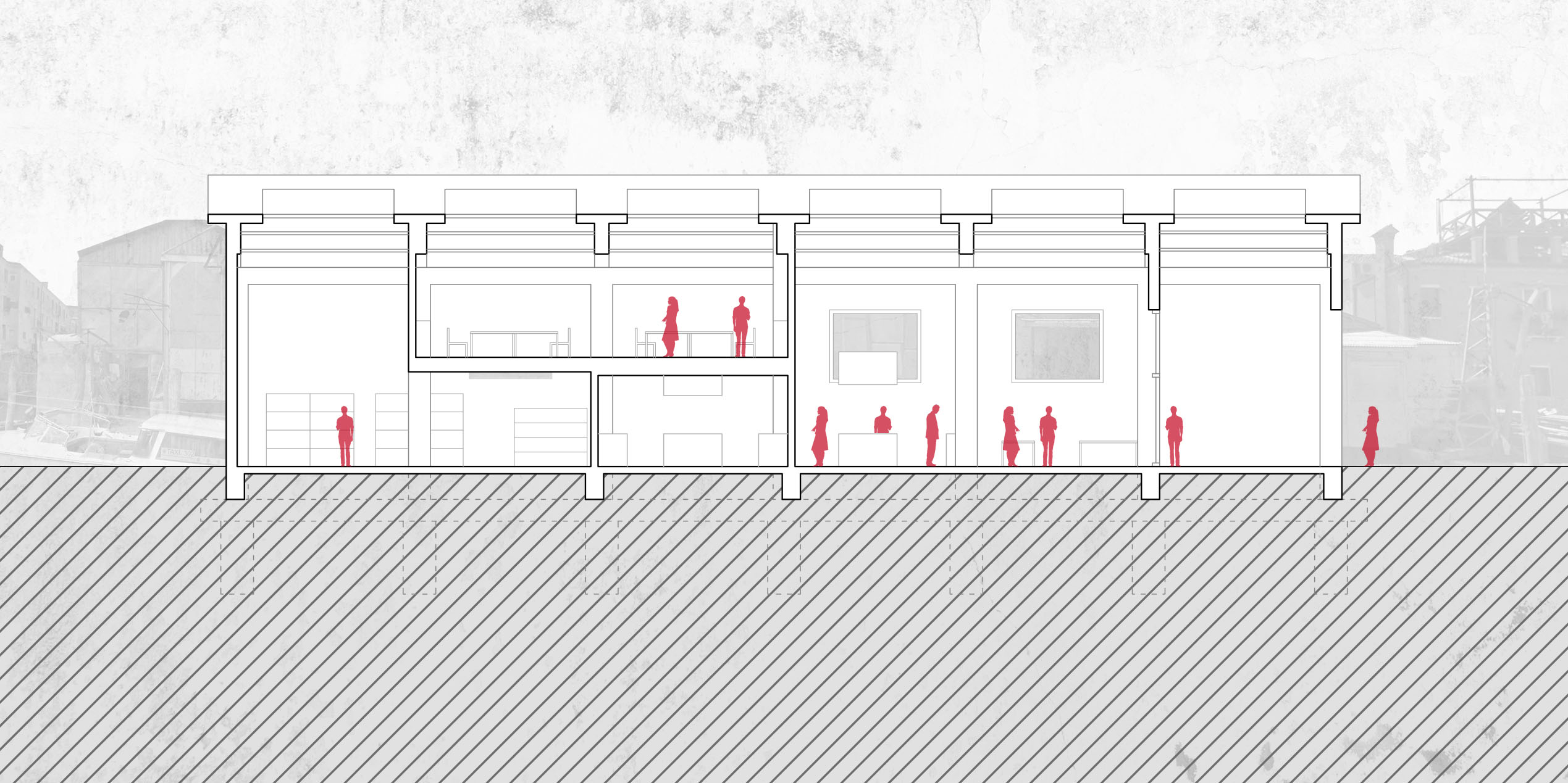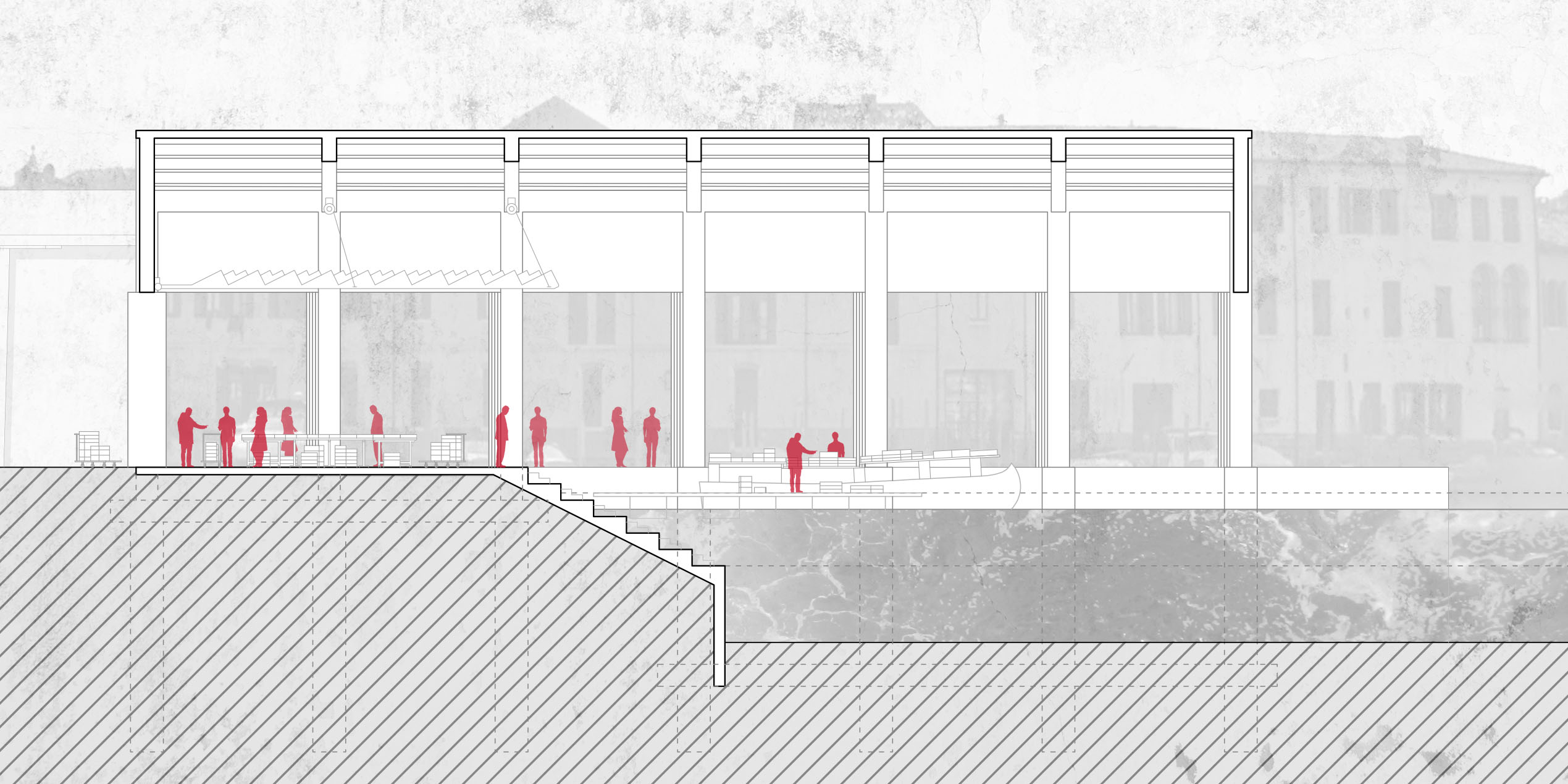 The Market+ project is situated in Sant’Elena, the easternmost part of the main Venetian island group. It’s designed with the revitalization project for the ACTV docks in mind. The area is currently a maintenance and repair hub for the Venetian public transport system. Three existing hangars have been redesigned to accommodate new functions and act as the central part of the future housing development.