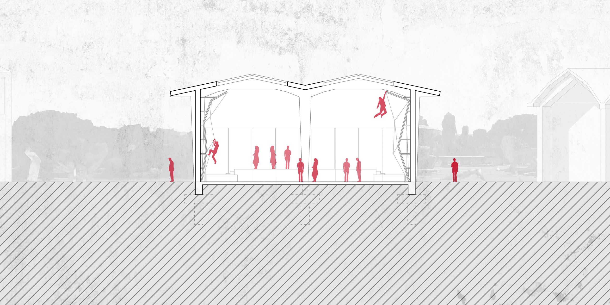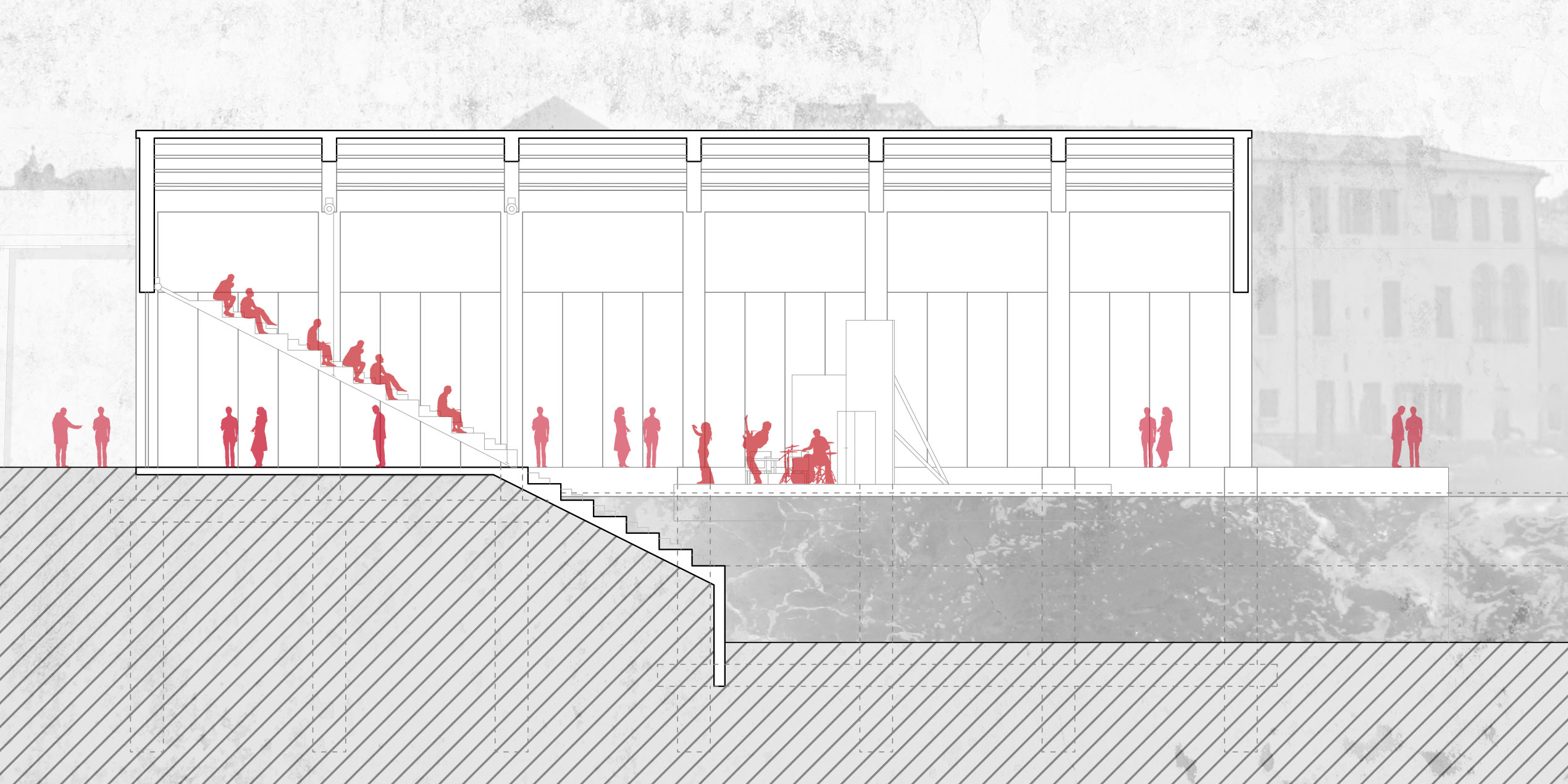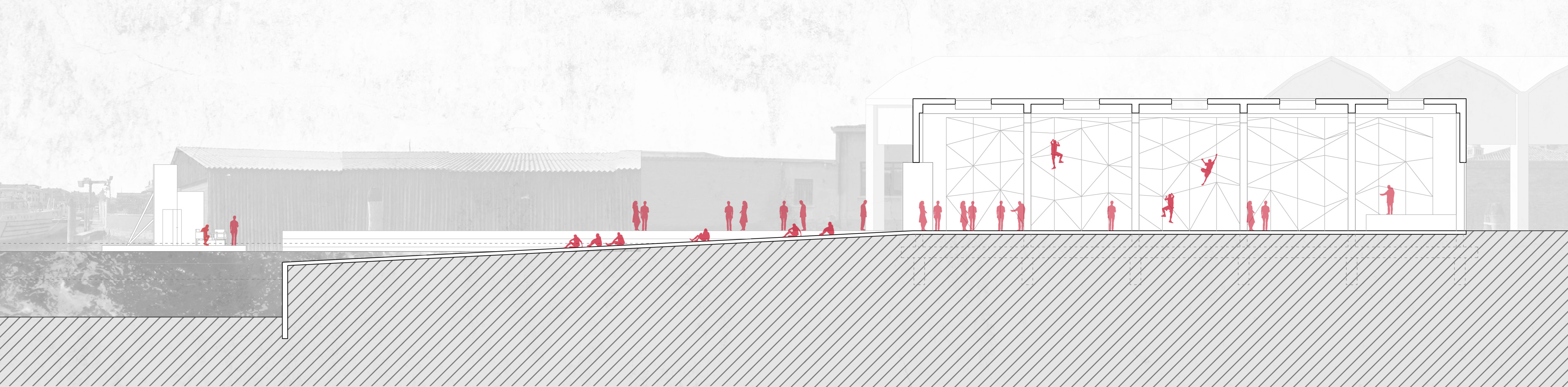 By addition and subtraction of walls and volumes the old industrial hangars have been refurbished into modern facilities with all-round use possibilities. As Sant’Elena is a tourist free district of Venice, we tried to keep it that way, organizing the functions of the buildings for people who live in an area that severely lacks infrastructure. A new pedestrian bridge is also planned to connect Sant’elena with San Pietro di Castello.