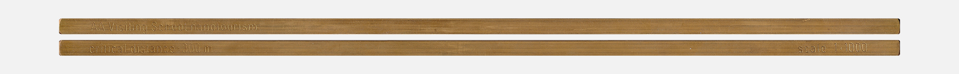 The critical distance is materialized as a brass ruler that presents the real distance of 300 meters between KSEVT and the last station of Potočnik’s pilgrimage scaled to a 30 centimeters long souvenir.