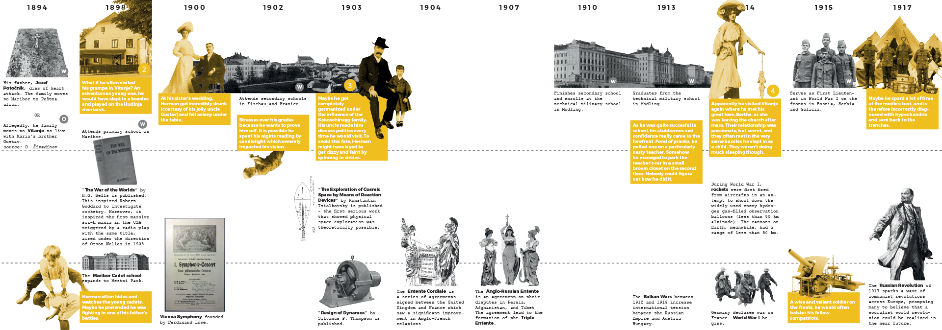The timeline seeks to collect all types of facts related to the work of Herman Potočnik Noordung.